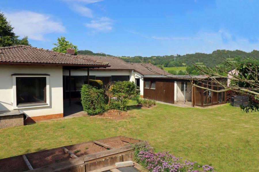 Angeboten wird ein frei stehender Bungalow mit Garage. In U-Form gebaut und südlich ausgerichtet, nach hinten ohne einen direkten Nachbarn. Gleich daneben die Garage (m. elk. Sektionaltor) mit einem angebauten Neben- oder Werkstattraum, dahinter ein ehem. Hundezwinger.