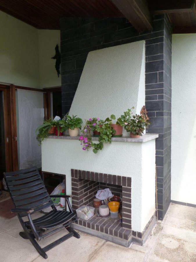 Auf einer Ebene, ein großes Wohnzimmer, über Eck verbunden mit dem anschließendem Esszimmer. Beide Räume mit Zugang zur Terrasse. Ansonsten ein Gäste-WC, ein Schlafzimmer, zwei Kinderzimmer, ein Badezimmer und die Küche mit Verbindung zum Esszimmer. Die Terrasse ist komplett überdacht und mit einem fest integrierten, offenen Kamin ausgestattet. Der Spitzboden unterm Dach als zusätzlicher Stauraum.