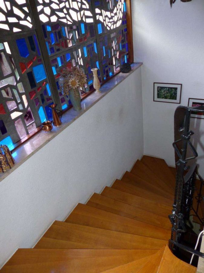 Der Eingangsbereich, mit dem Windfang ist ebenerdig begehbar. Dahinter erschließt sich ein Foyer (gr. Diele) mit einem künstlerisch gestalteten Fensteraufbau aus Glas.