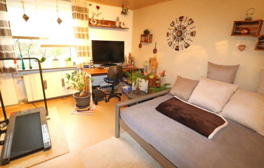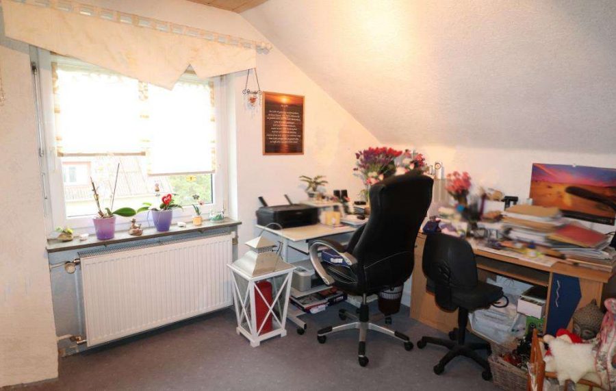 Im Giebelbereich ein Studiozimmer, derzeit als Kinderzimmer genutzt. Gleich daneben der ausbaufähige Dachboden mit der gedämmten Geschossdecke. Das untere Stockwerk mit zwei Kinderzimmern sowie Arbeitszimmer und ein zusätzliches Badezimmer mit Dusche, Waschbecken und WC. Nach hinten abgesetzt ein Vorratsraum, ein Waschraum und der Heizungsraum.