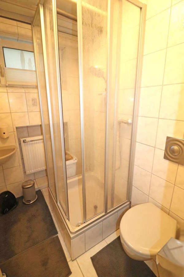 Der Haupteingangsbereich mit Gäste-WC, Windfang und Zugang zum Wintergarten. Die Verbindungstreppe zum Keller und zum Obergeschoss verläuft gerade und ist mittig angeordnet. Im eigentlichen Erdgeschoss eine große Wohnküche mit EBK, ein Abstellraum, ein Wohnzimmer mit Kaminofen, ein Schlafzimmer und ein Badezimmer mit WC, Waschbecken, Dusche und Badewanne.