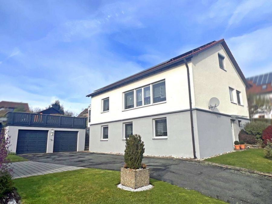 Im Verkauf steht ein gepflegtes Wohnhaus mit Garage und Doppelgarage von 1992. Die vordere Garage ist durch Terrassenplatten abgedeckt und nach oben hin begrenzt mit einem Geländer.