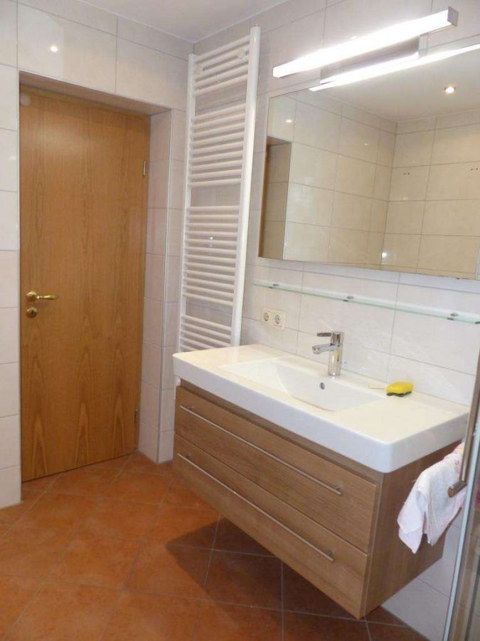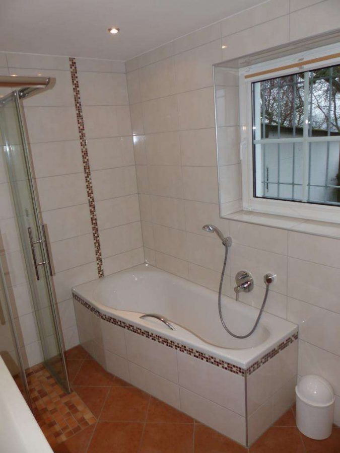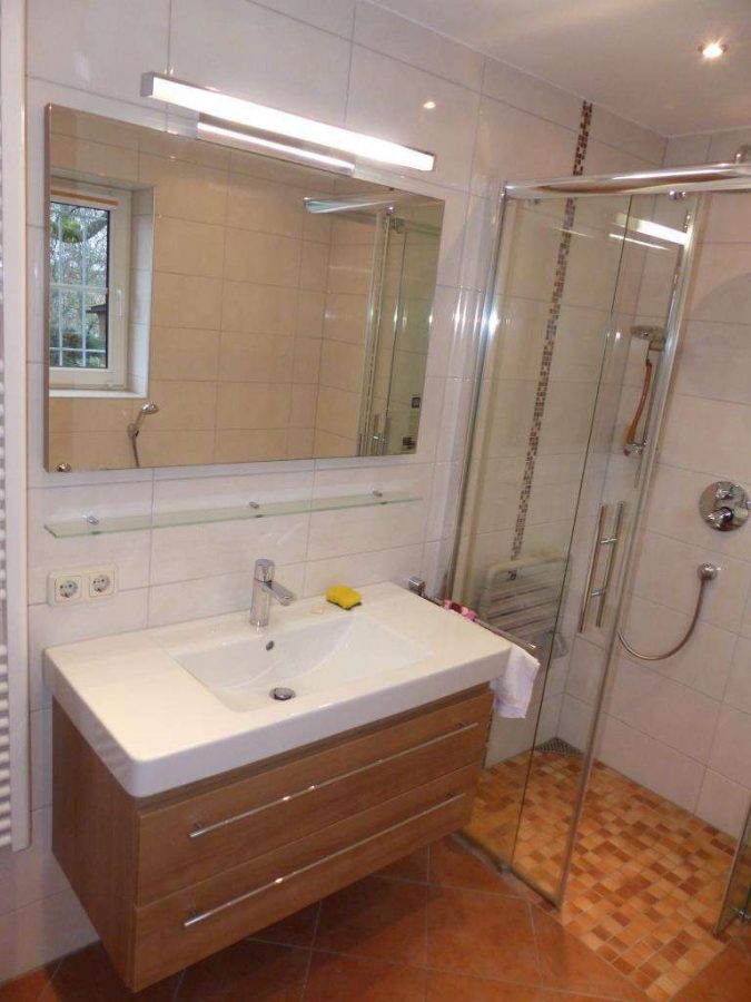 Im Erdgeschoss befindet sich ein Badezimmer mit Fußbodenheizung, Badewanne, Dusche, Waschtisch mit Spiegel und modernen Unterschrank. Eine große Küche inkl. der EBK und das Esszimmer mit anschließendem Wohnzimmer. Nähe der Treppe das Gäste-WC sowie ein weiteres WC im halbgewendetem Treppenaufgang.