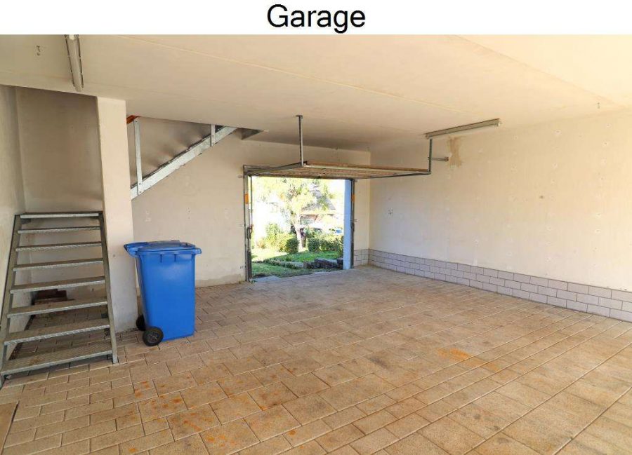 Die großzügig gehaltene Doppelgarage (Platz für zwei große Fahrzeuge und Anhänger) mit einem seitlich wegfahrenden elektrischen Garagentor. Über der eigentlichen Garage ein nicht ausgebautes Studiozimmer mit großem Eckfenster. Die Anschlüsse für einen nachträglichen Ausbau sind teilweise vorhanden. Hinter dem Haus ein überdachter Freisitz, seitlich an die Garage angebaut.