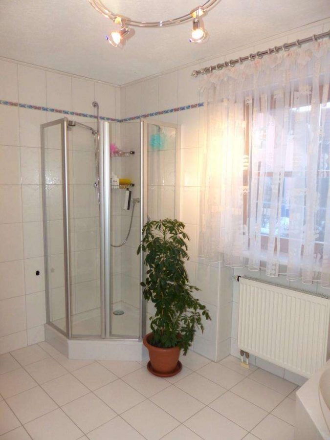 Im Erdgeschoss vorgelagert der Windfang. Gleich nebenan, ein großes Badezimmer mit Eckwanne, Dusche, WC und Doppelwaschbecken. Die Küche mit Speisekammer und Zugang zum Wohnzimmer. Besonders auffällig, der Erker als Essplatz und der mittig angeordnete Schwedenofen sowie die große, nicht einsehbare Süd-Terrasse zum Garten. Ein zusätzliches Schlaf- oder Kinderzimmer im Erdgeschoss, neben der Treppe.