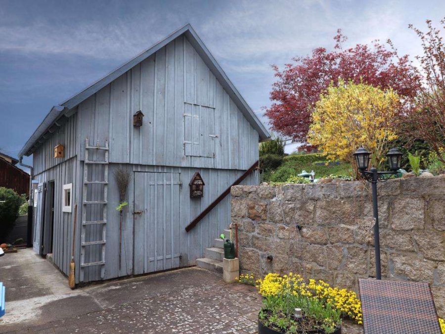 Hinter der Garage ein schöner Terrassenbereich, ideal zum Feiern und Grillen. Gleich daneben ein größerer Schuppen als Nebengebäude, genutzt als Werkstatt und Geräteraum.
