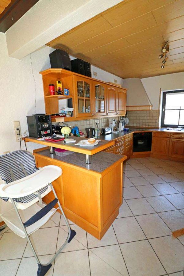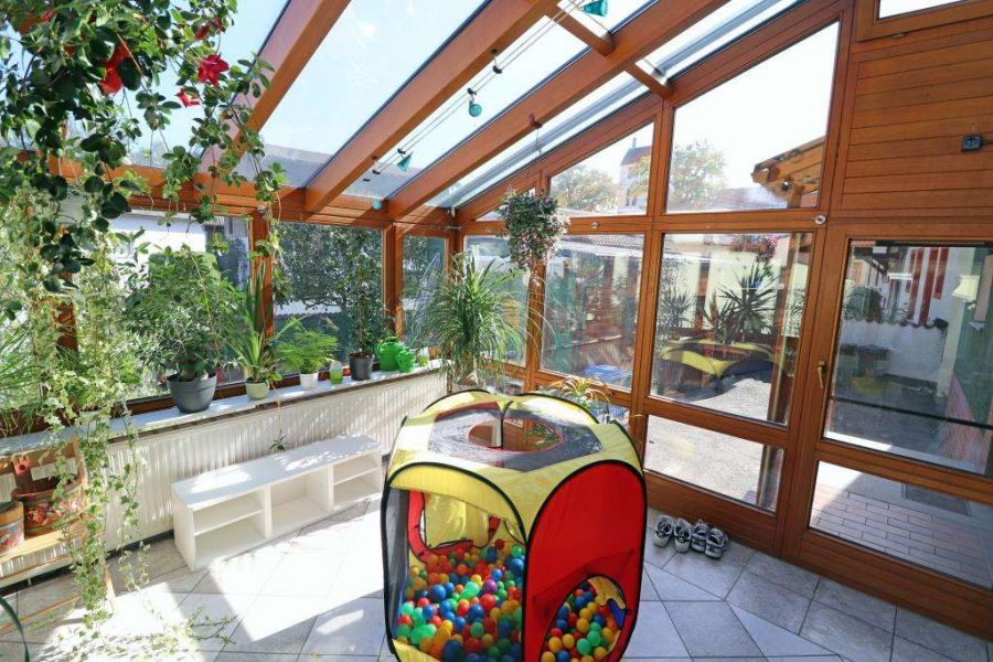 Der Zugang zum Haus, überdacht und mit Granitplatten belegt. Das Treppenhaus, den Wohnungen vorgelagert. Im Erdgeschoss der Flur mit Verbindung zum Wohnzimmer und dem angebauten Wintergarten, alles lichtdurchflutet und hell. Im Anschluss ein Schaf- und ein Kinderzimmer. Die Wohnküche mit Kachelofen und Zugang zum Badezimmer.