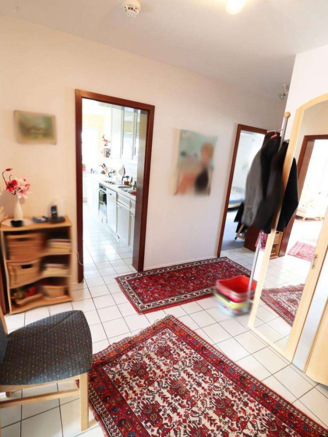 Im Eingangsbereich der Diele eine Abstellkammer, dann im Anschluss ein Kinderzimmer, ein Schlafzimmer und das großzügige Wohn- und Esszimmer mit Zugang zum Balkon. Die mittig gelegene Küche mit einem ausgestellten Erkerbereich, gut für einen kl. Essplatz. Daneben ein sep. Gäste-WC und das Badezimmer mit Wanne, Dusche, Waschbecken und WC.