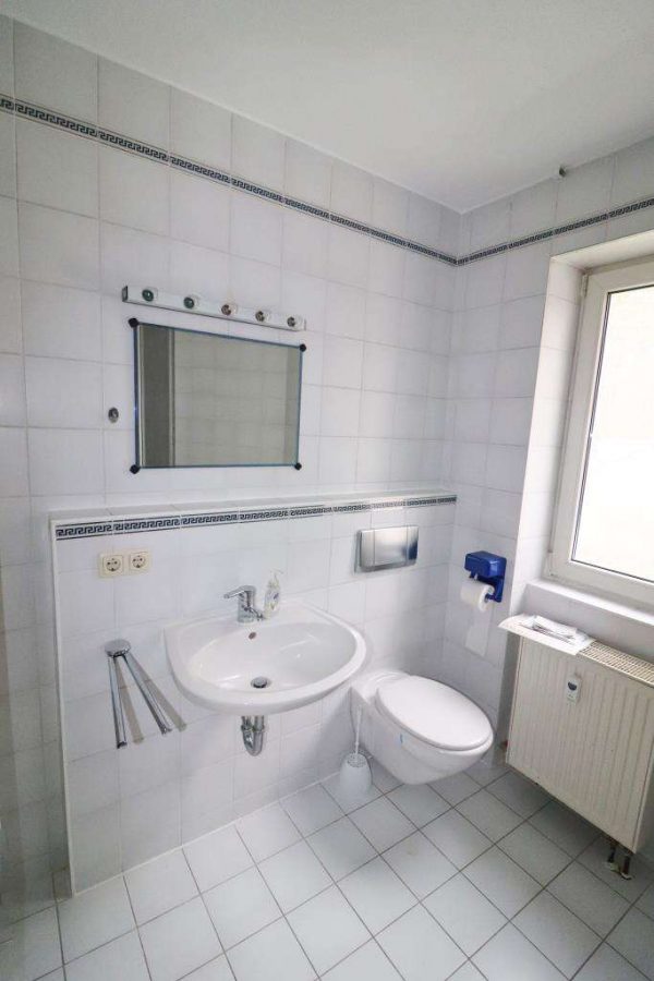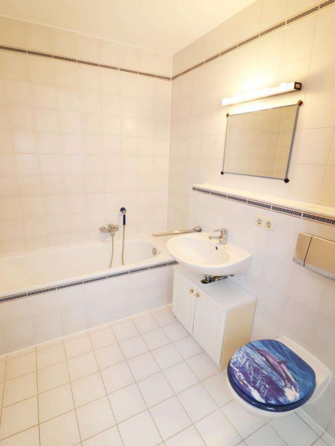 Seitlich daneben ein Gäste- und Kinderzimmer. Durch einen kleinen Flur etwas abgesetzt, das Schlafzimmer direkt mit dem zweiten Badezimmer verbunden. Das zweite Bad mit Fenster, Wanne, WC und Waschbecken. Die Zugänge zum Nord- und Südbalkon beidseitig über die Wohndiele und über das Wohnzimmer.