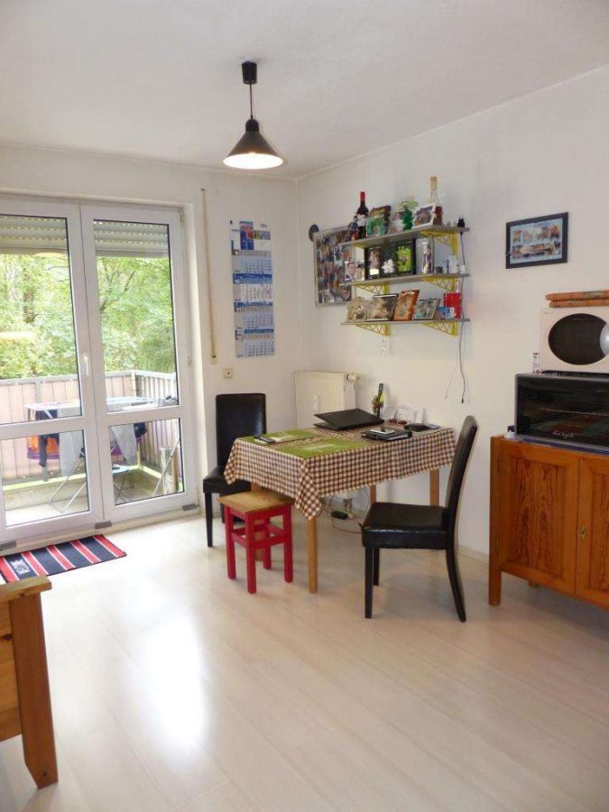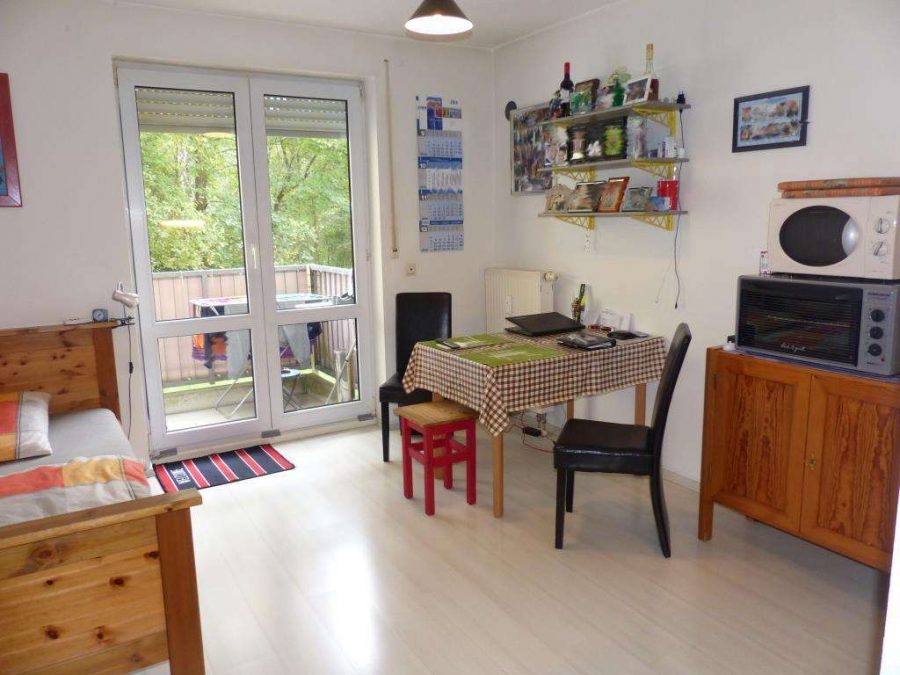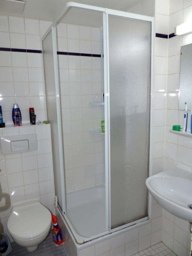 Im Eingangsbereich ein kleine Abstellfläche und ein Badezimmer mit Dusche, WC und Waschbecken. Der Wohn- und Schlafraum mit Kochecke und Zugang zum Balkon. Alles ansprechend und ordentlich gepflegt, ideal zur Vermietung.