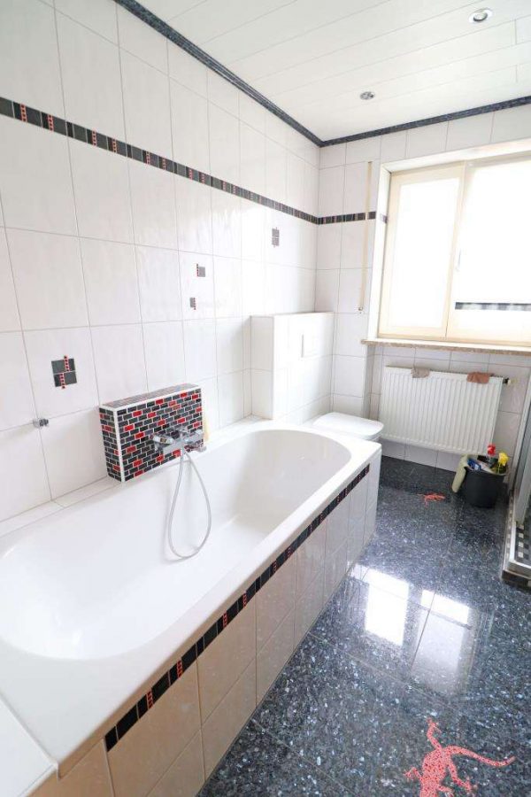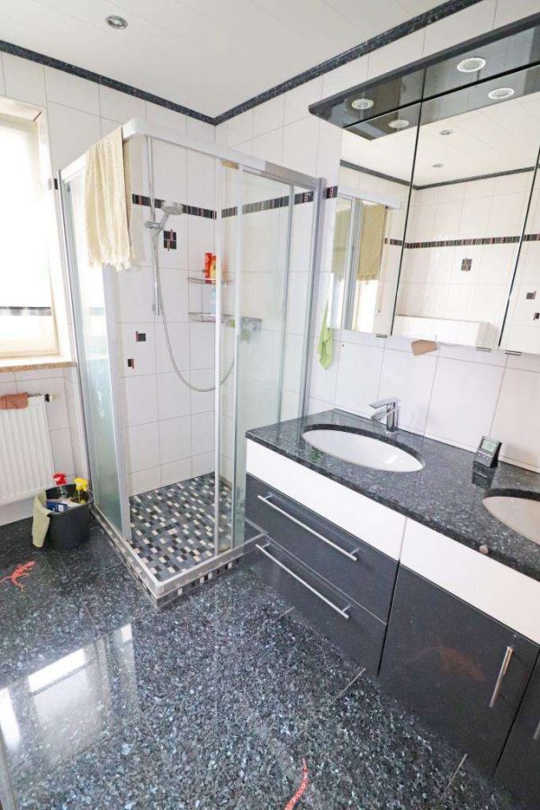 Nach dem Eingang eine offene Diele mit Verbindung zur Wohnküche mit anschließender Speise. Daneben das offen gestaltete Wohn- und Esszimmer sowie zwei große Kinderzimmer und ein Schlafzimmer. Das moderne Badezimmer mit WC, Doppelwaschbecken, großer Dusche und Badewanne. Nicht zur vergessen ein separater Garderobenbereich und ein Gäste-WC.